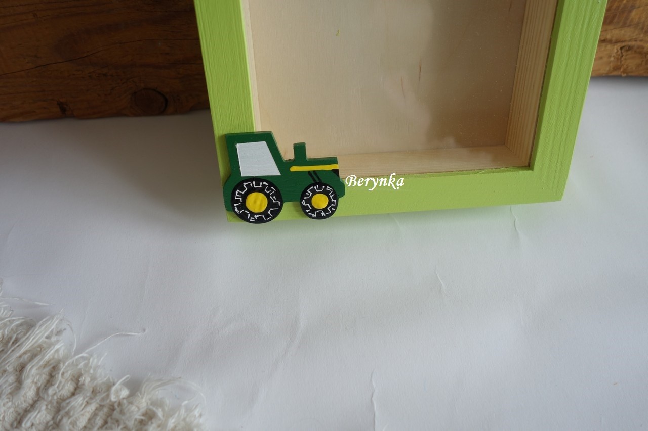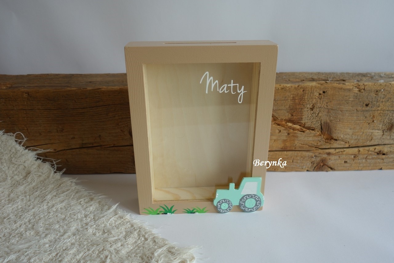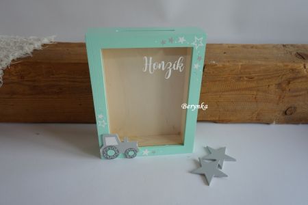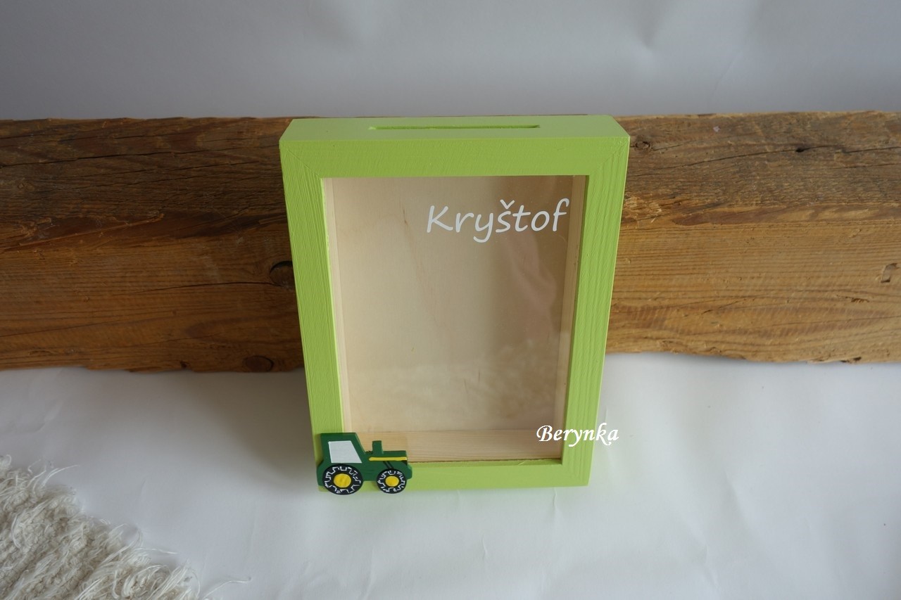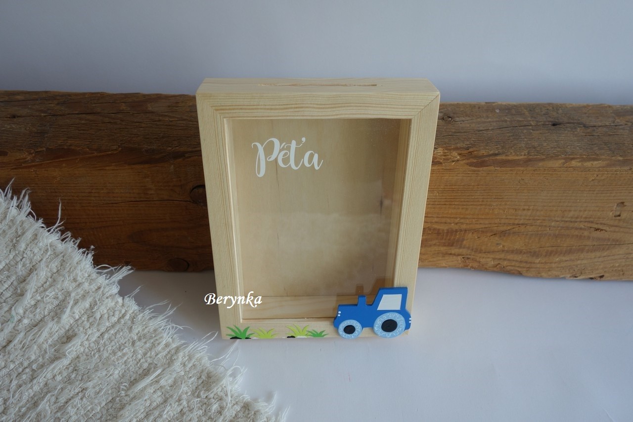 - traktůrek je ručně vyřezaný z překližky a na pokladničce nalepený