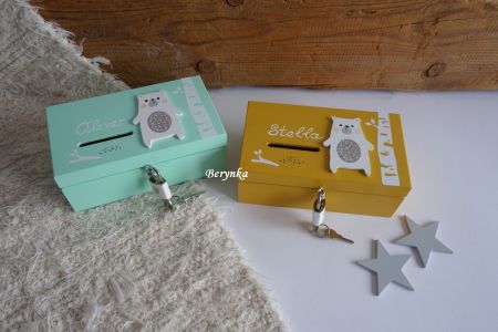 Dřevěná pokladnička s medvídkem podle předlohy