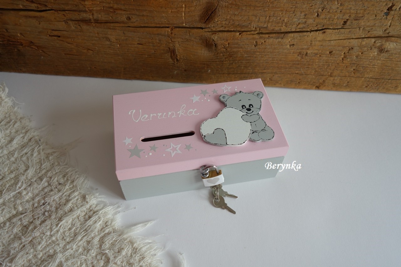 Dřevěná pokladnička s medvídkem se srdíčkem