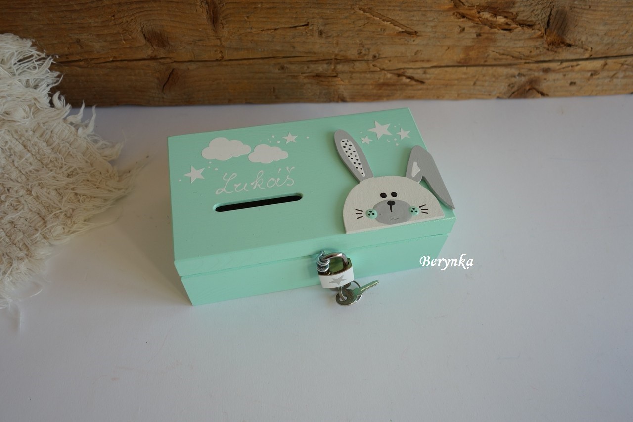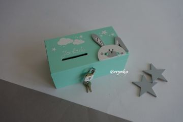 Dřevěná pokladnička se zajíčkem a hvězdičkami