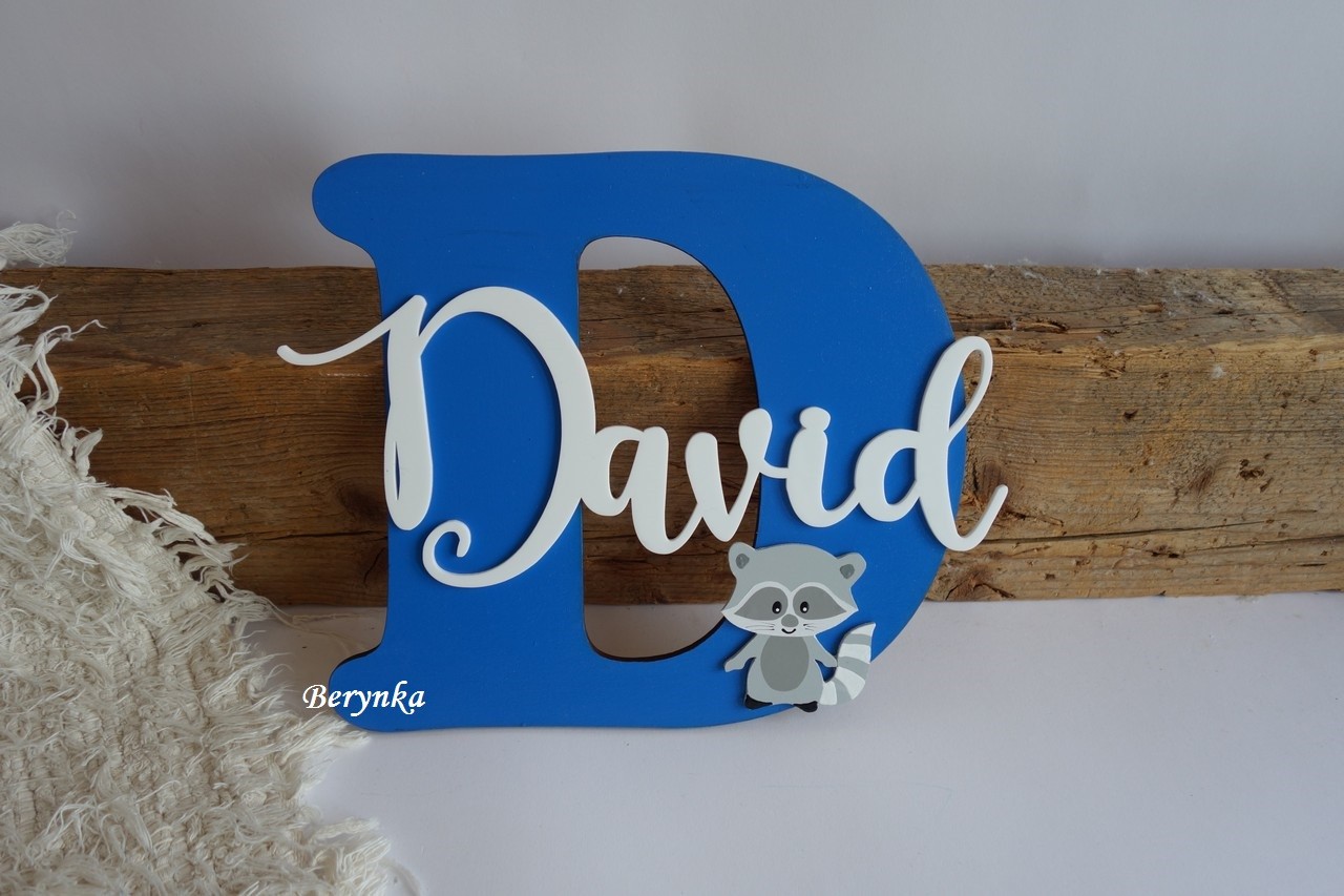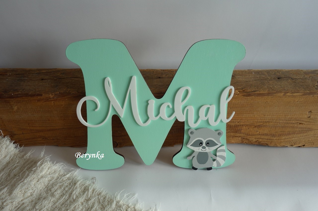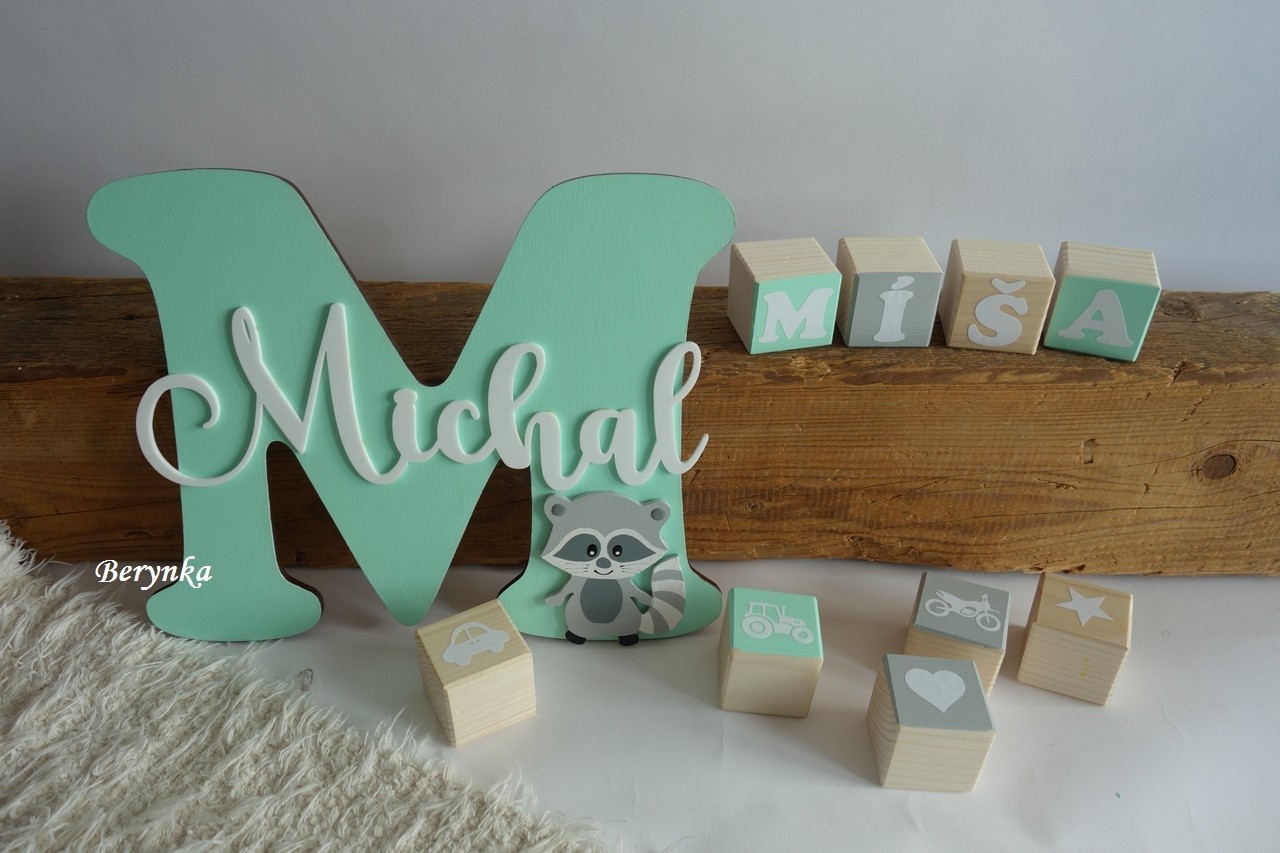 Dřevěné písmeno se jménem a mývalem