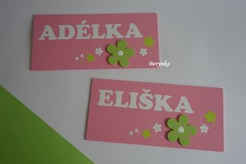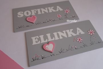 Dřevěné cedulky můžou ozdobit dveře a stěny Vašich dětských pokojíčků. Lze je vyrobit v jakékoli barevné kombinaci a dekoru.