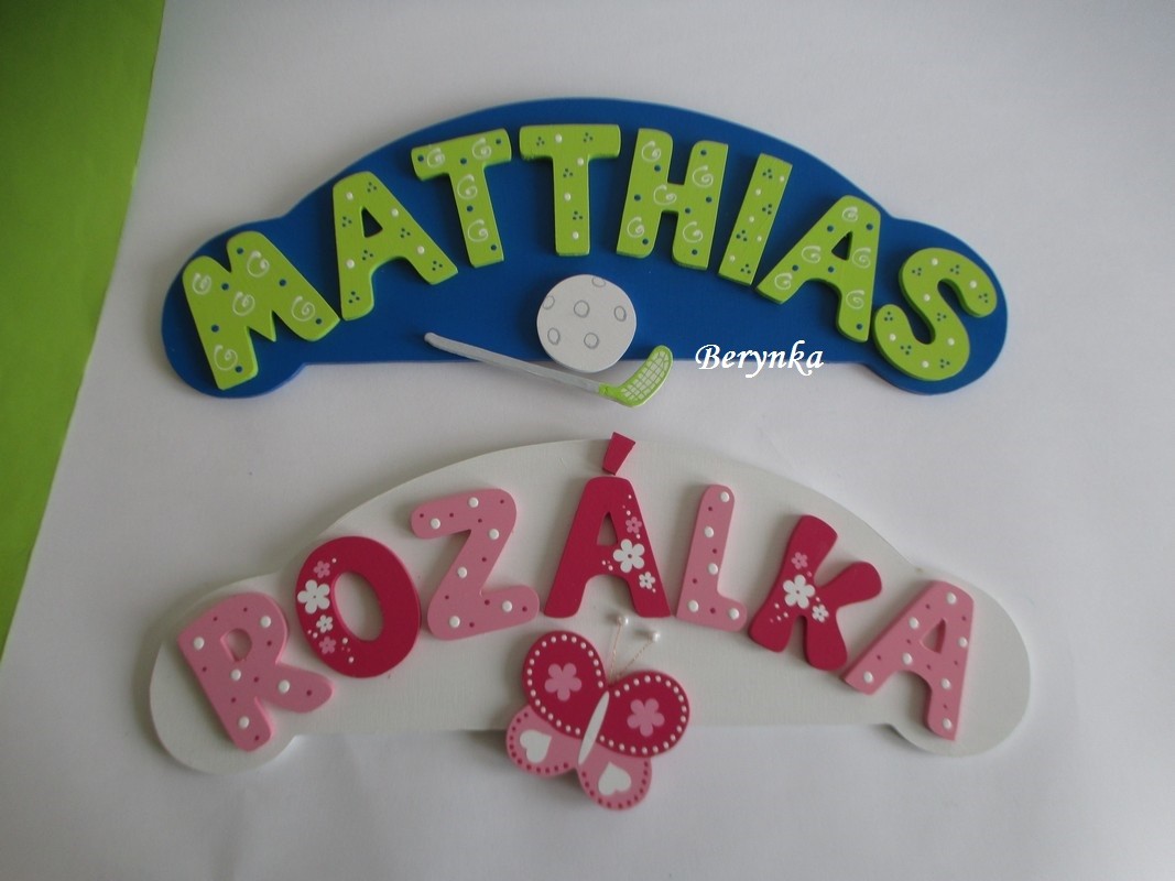 - jmenovka s písmenky je vyřezaná z překližky, ručně malovaná a zdobená, je přelakovaná - je možné jí snadno otírat