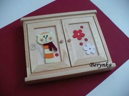 - kocourek a kytičky jsou ručně vyřezané z překližky a na skříňce nalepené