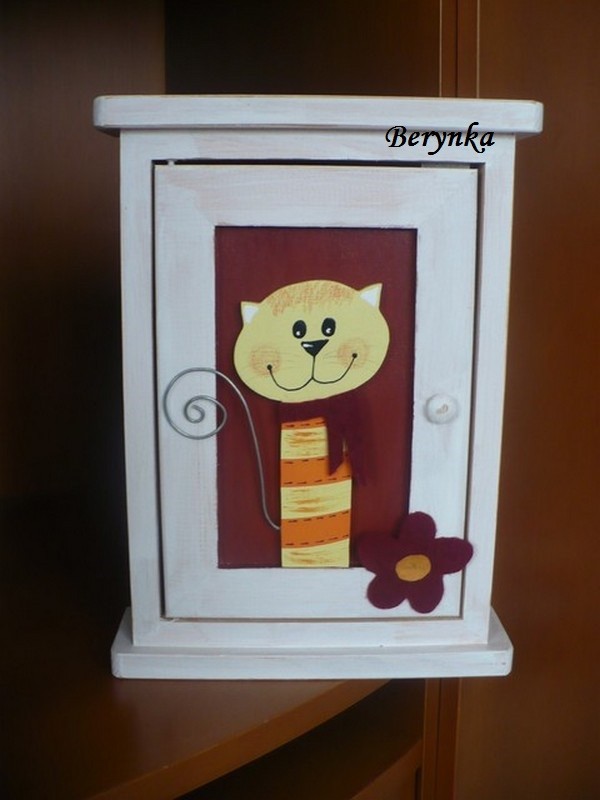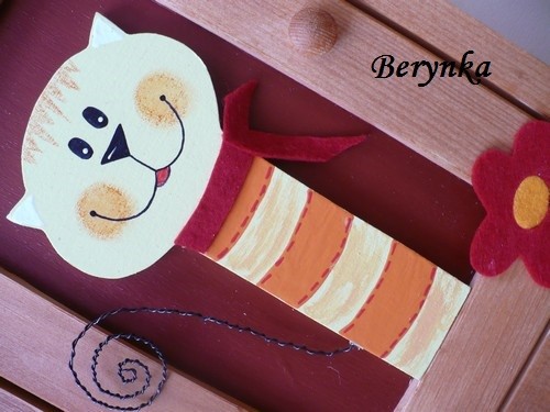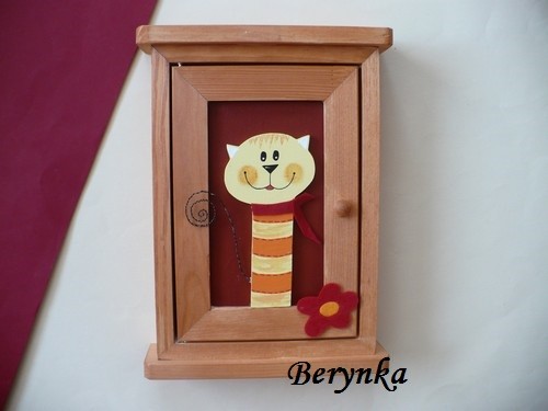 - kocour je ručně vyřezaný z překližky a na skříňce nalepený, ocásek má z drátu, šála a kytička jsou z filcu