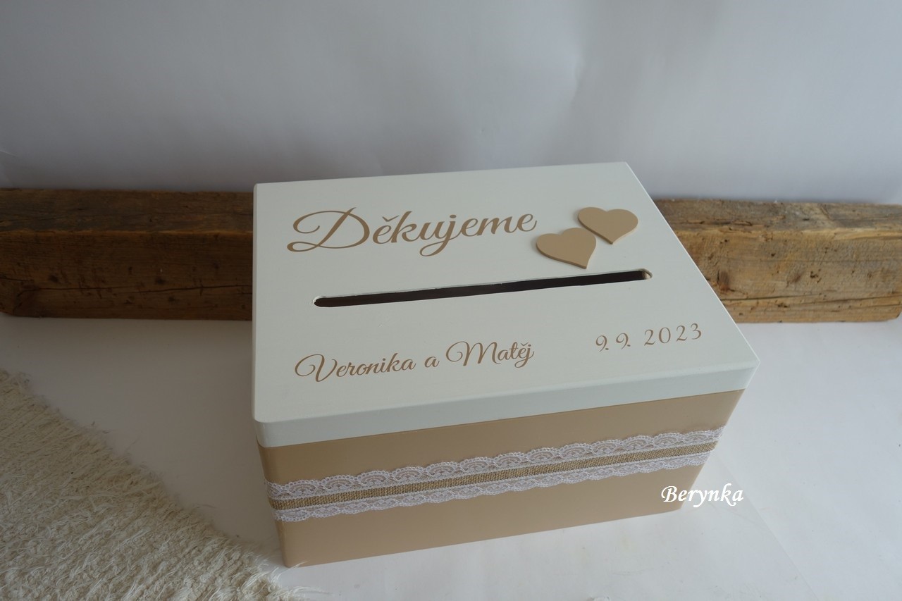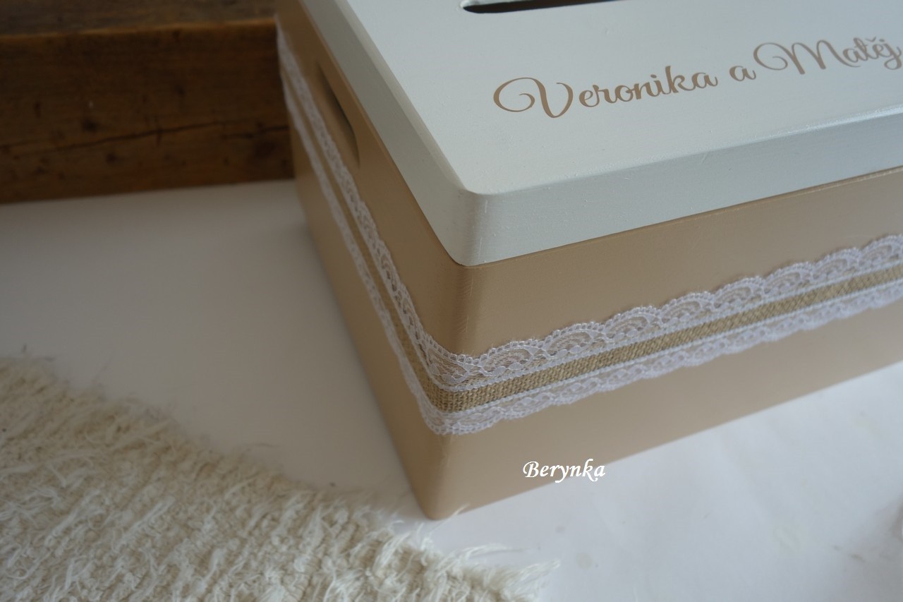 - krabice je vhodná na svatbu na přáníčka, obálky … a později na uložení různých svatebních drobností (svatebního oznámení, blahopřání, dekorací, jmenovek, fotek … ) nebo může být použita jako "obal" na svatební dar