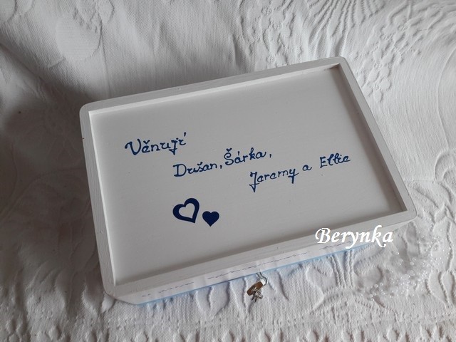 - bedýnka je vhodná na svatbu na přáníčka, obálky … a později na uložení různých svatebních drobností (svatebního oznámení, blahopřání, dekorací, jmenovek, fotek … ) nebo může být použita jako "obal" na svatební dar
