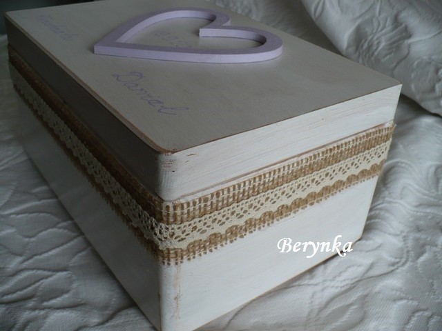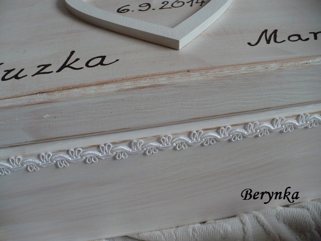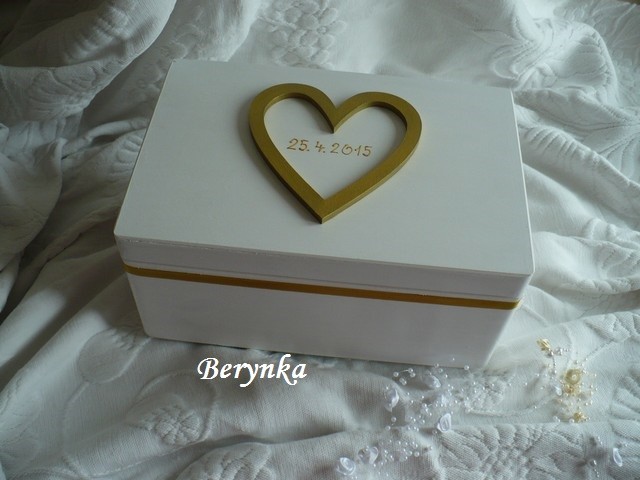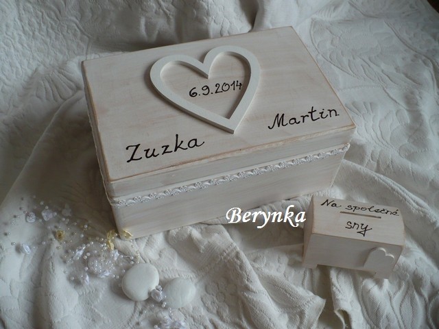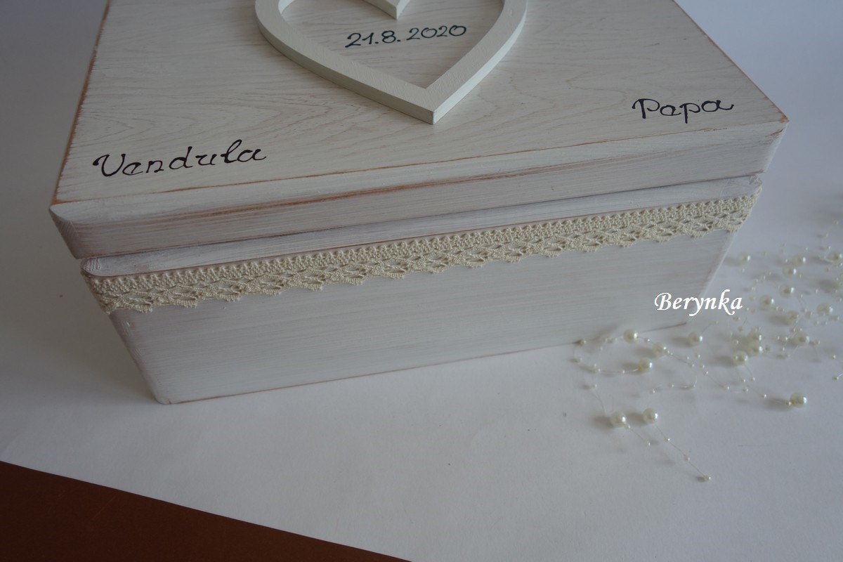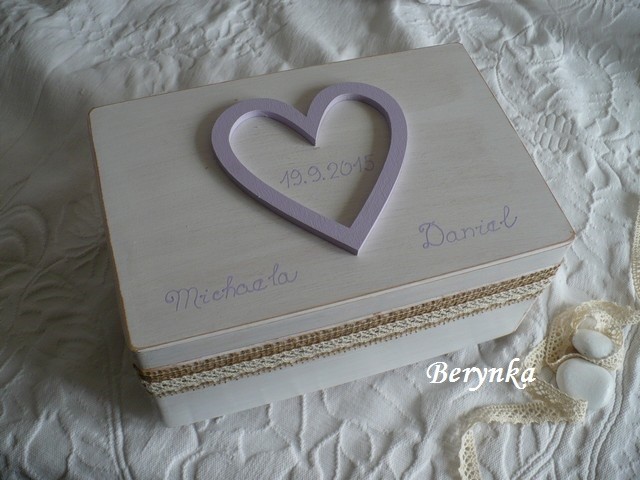 - krabice je vhodná na svatbu na přáníčka, obálky … a později na uložení různých svatebních drobností (svatebního oznámení, blahopřání, dekorací, jmenovek, fotek … ) nebo může být použita jako "obal" na svatební dar