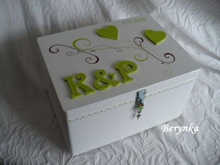 - krabice je vhodná na svatbu na přáníčka, obálky … a později na uložení různých svatebních drobností (svatebního oznámení, blahopřání, dekorací, jmenovek, fotek … ) nebo může být použita jako "obal" na svatební dar