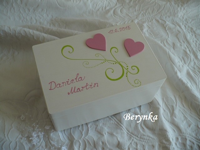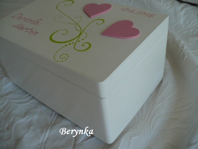 - krabice je vhodná na svatbu na přáníčka, obálky … a později na uložení různých svatebních drobností (svatebního oznámení, blahopřání, dekorací, jmenovek, fotek … ) nebo může být použita jako "obal" na svatební dar