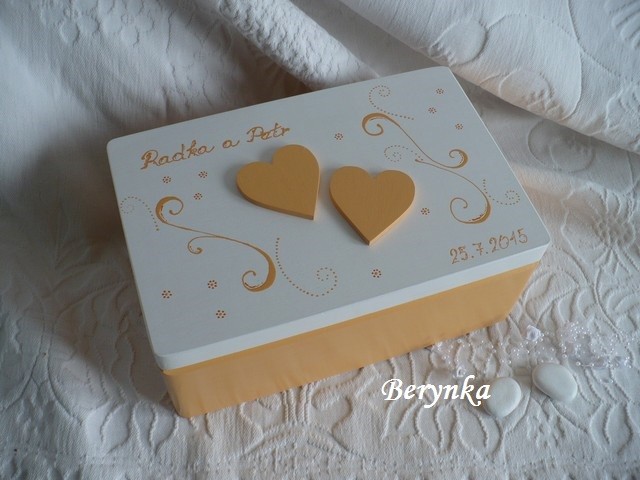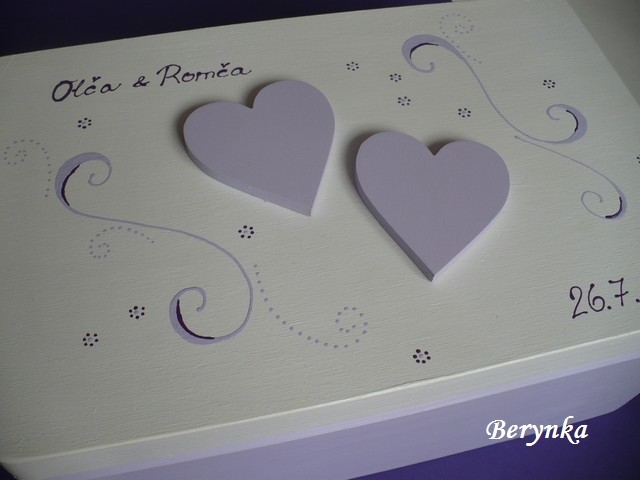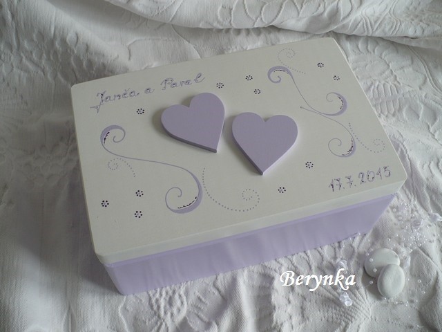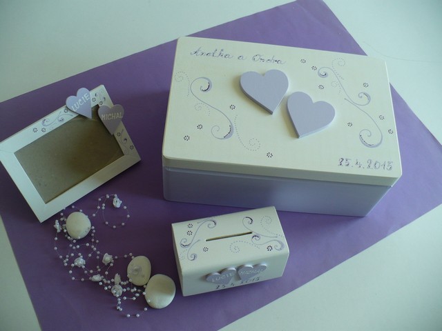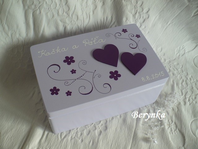 - krabice je vhodná na svatbu na přáníčka, obálky … a později na uložení různých svatebních drobností (svatebního oznámení, blahopřání, dekorací, jmenovek, fotek … ) nebo může být použita jako "obal" na svatební dar