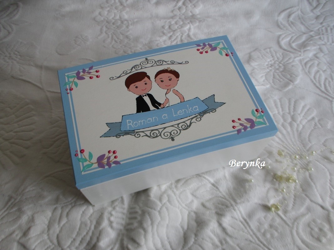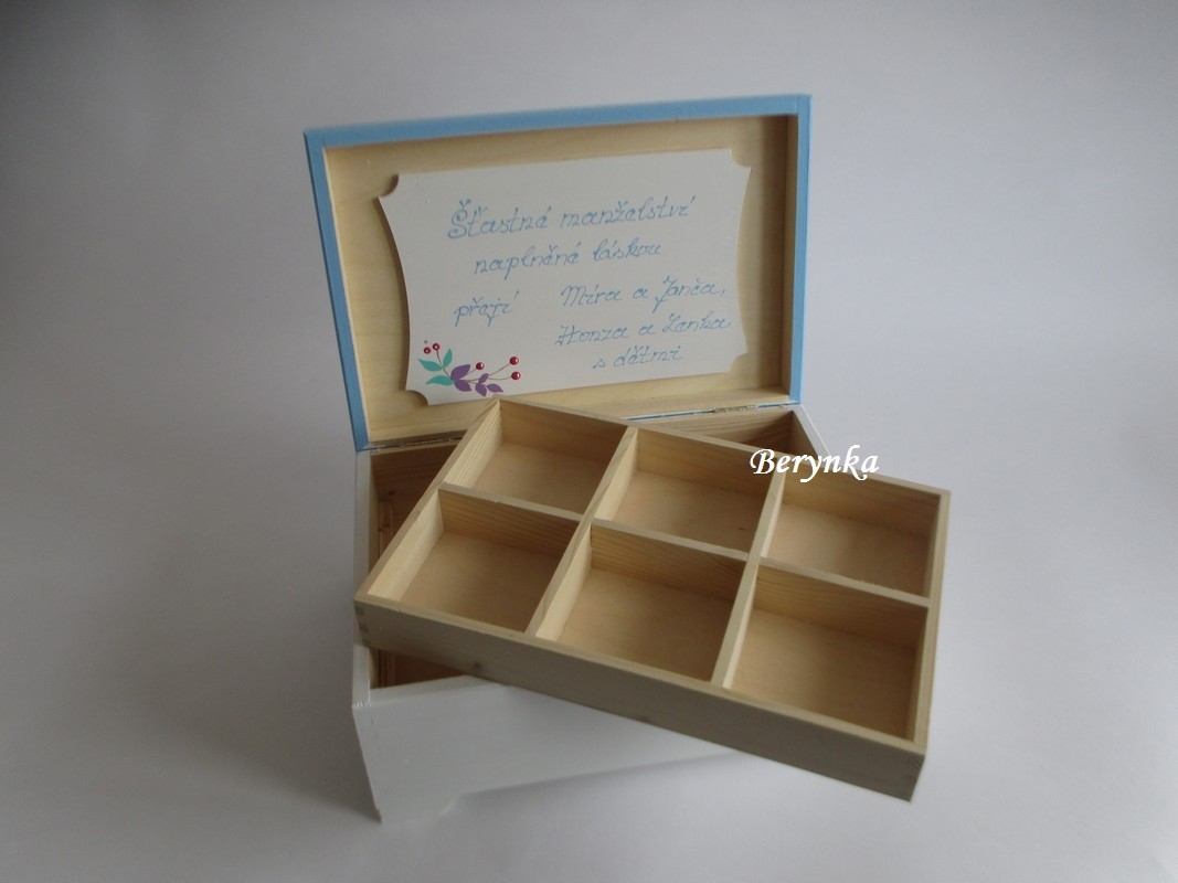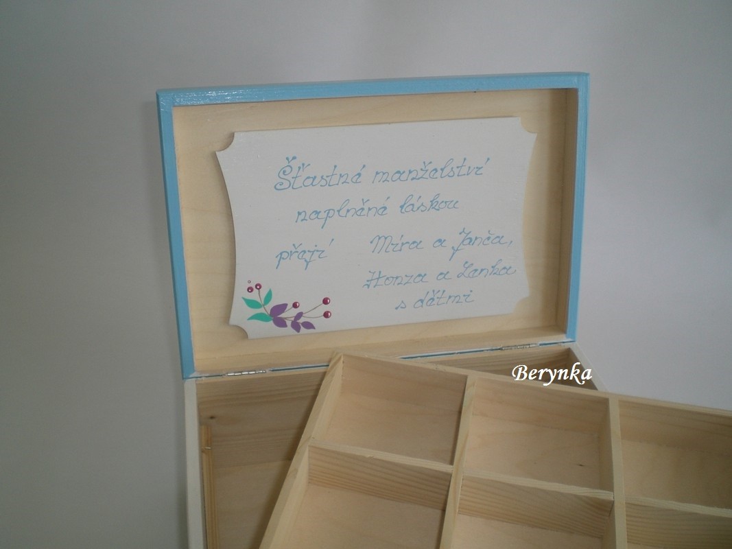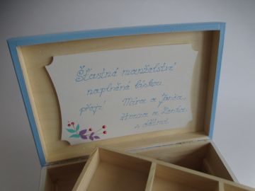 - truhlička je vhodná na svatbu na přáníčka, obálky … a později na uložení různých svatebních drobností (svatebního oznámení, blahopřání, dekorací, jmenovek, fotek … ) nebo může být použita jako "obal" na svatební dar