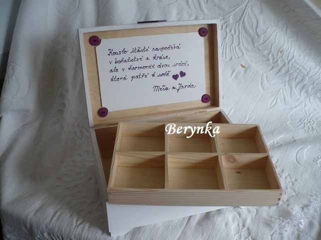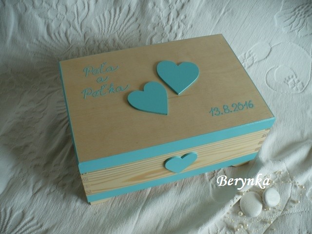 - truhlička je vhodná na svatbu na přáníčka, obálky … a později na uložení různých svatebních drobností (svatebního oznámení, blahopřání, dekorací, jmenovek, fotek … ) nebo může být použita jako "obal" na svatební dar
