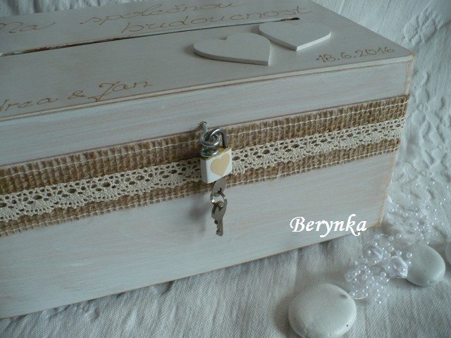 - truhlička je vhodná na svatbu na přáníčka, obálky … a později na uložení různých svatebních drobností (svatebního oznámení, blahopřání, dekorací, jmenovek, fotek … ) nebo může být použita jako "obal" na svatební dar