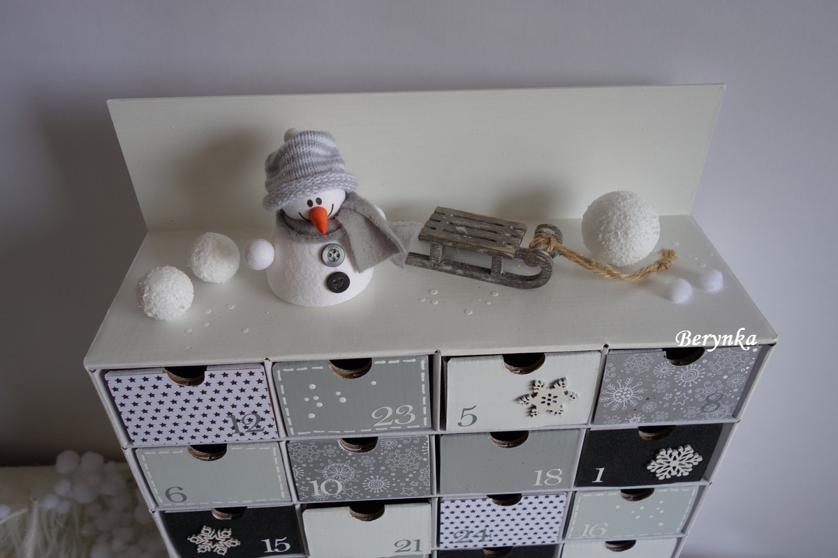 Adventní kalendář bílo-šedý se sněhuláčkem a sáňkami