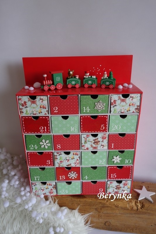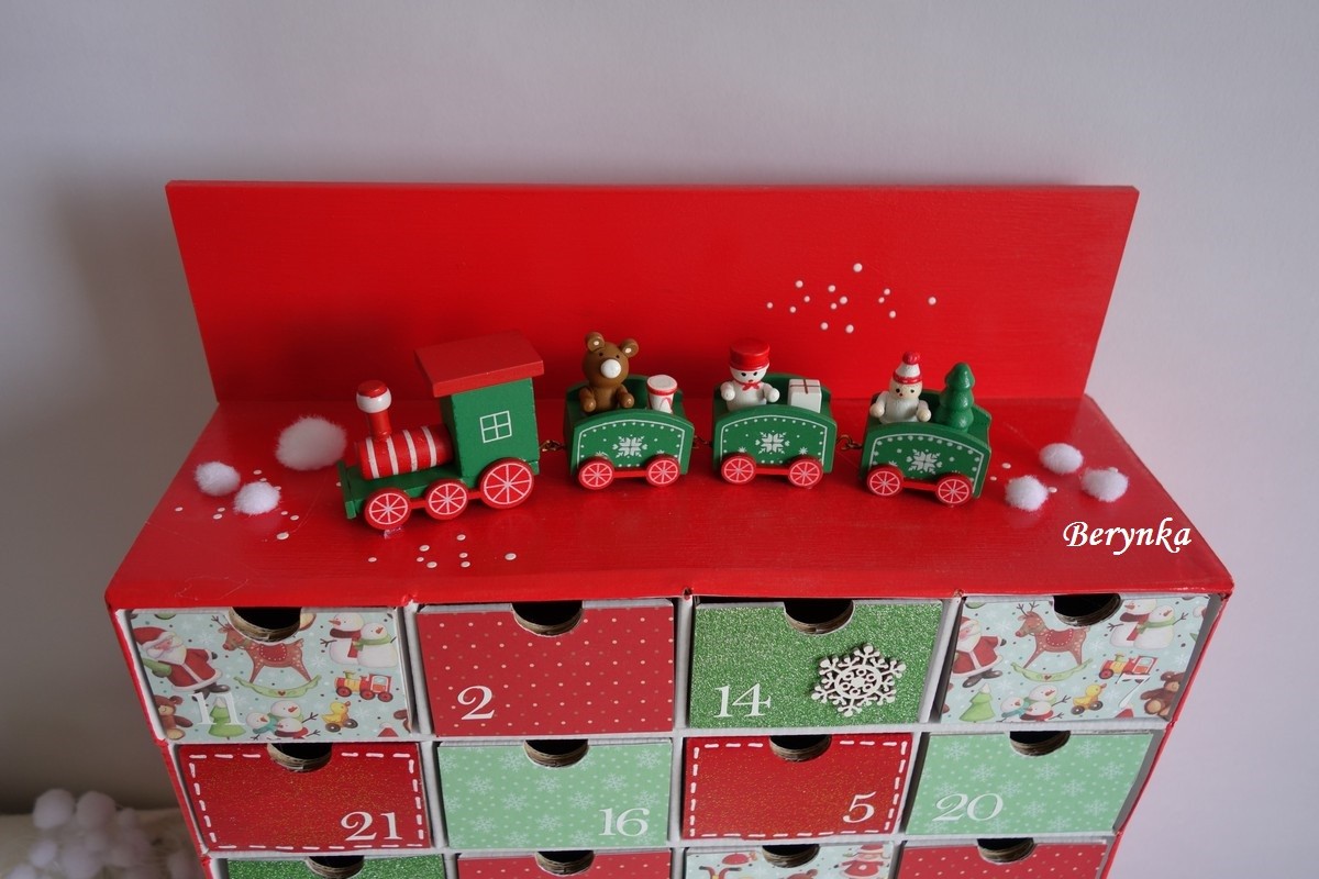 Adventní kalendář červeno-zelený s dřevěným vláčkem