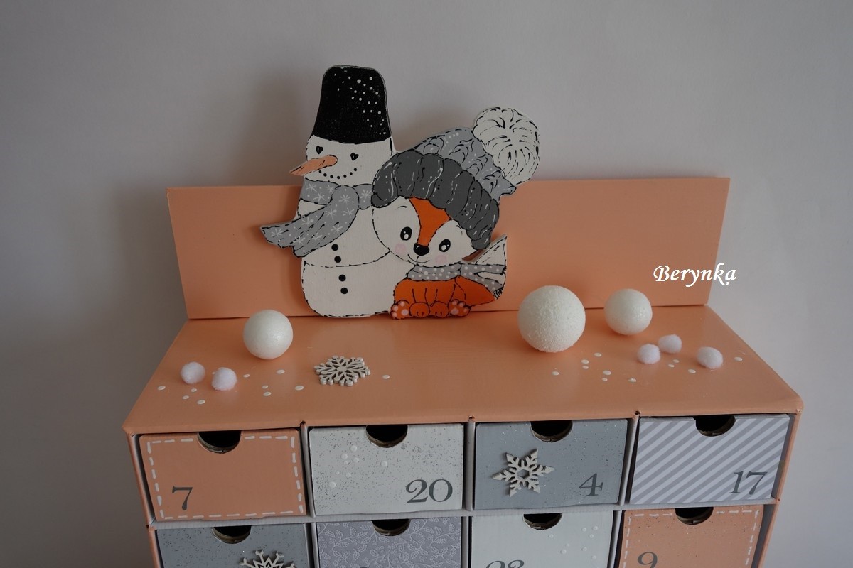 Adventní kalendář meruňkovo-šedý se sněhulákem a liškou
