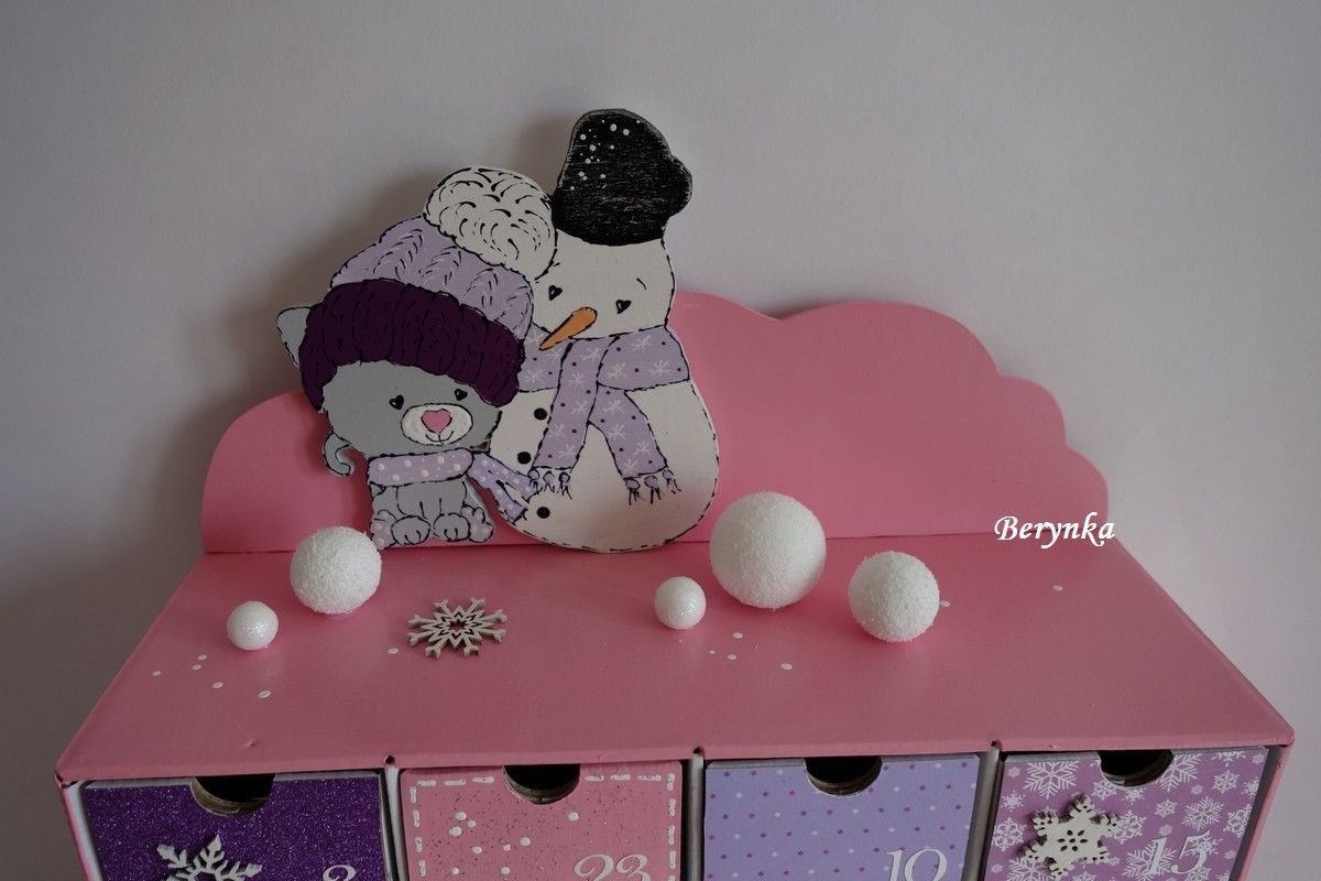 Adventní kalendář růžovo-fialový se sněhulákem a kočičkou