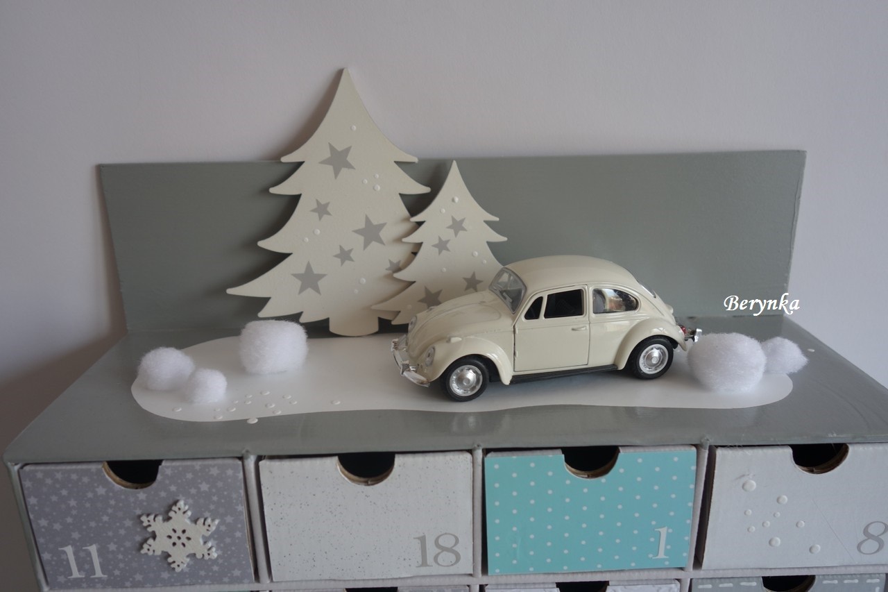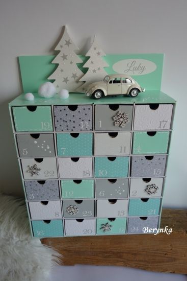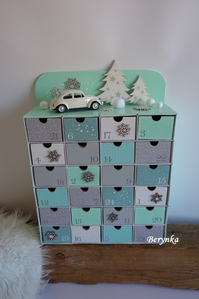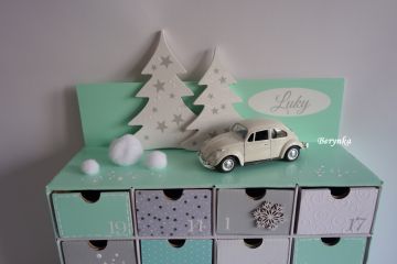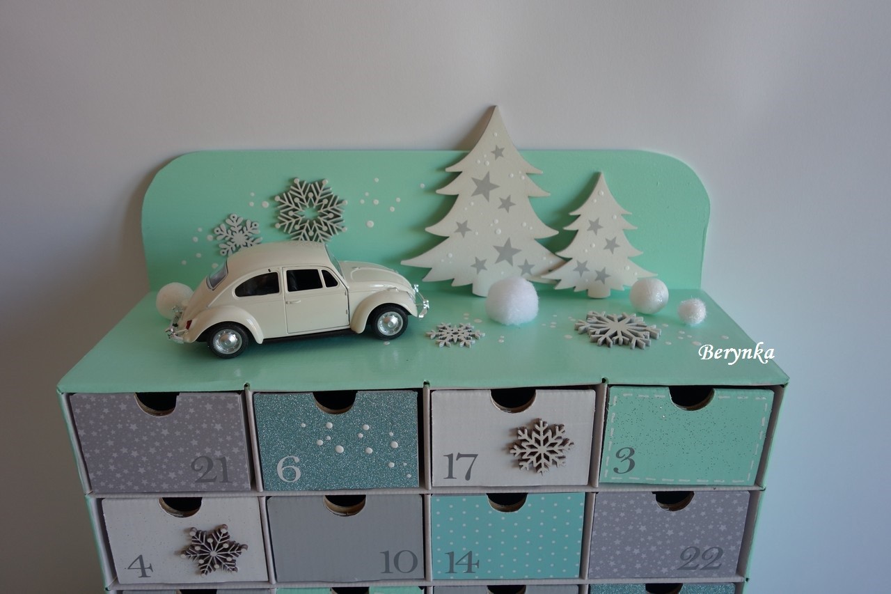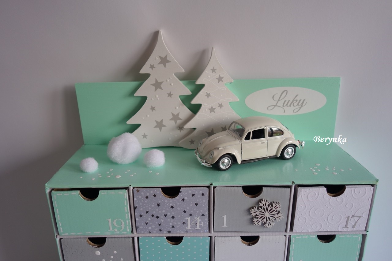 Adventní kalendář mátovo-šedý s autíčkem - různá provedení