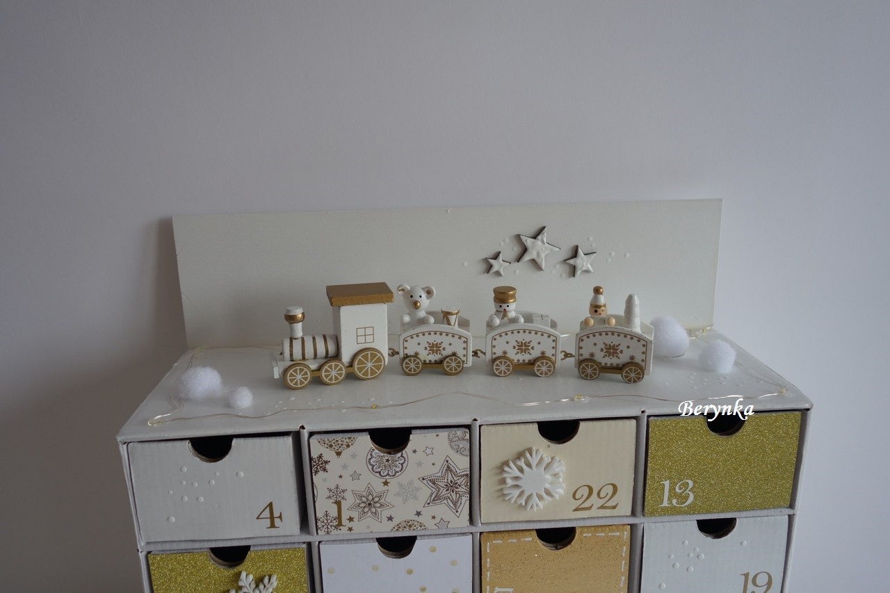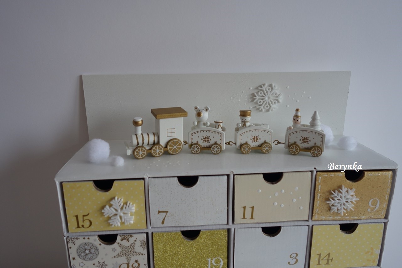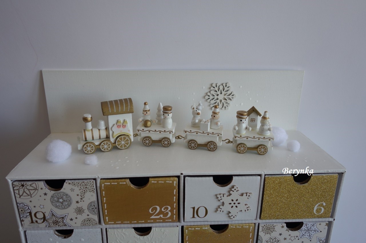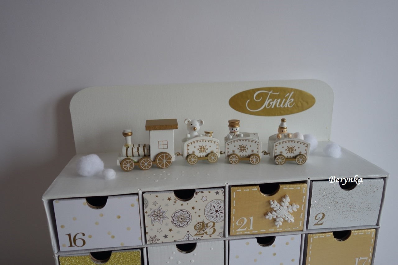 Adventní kalendář bílo-zlatý s dřevěným vláčkem