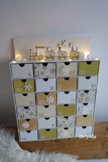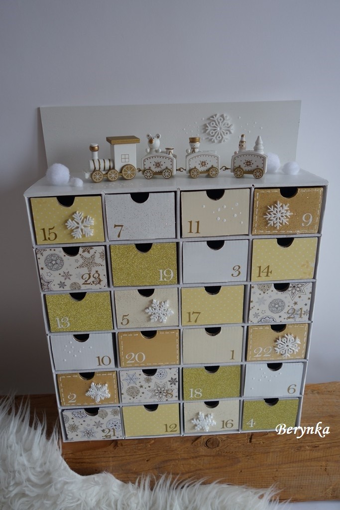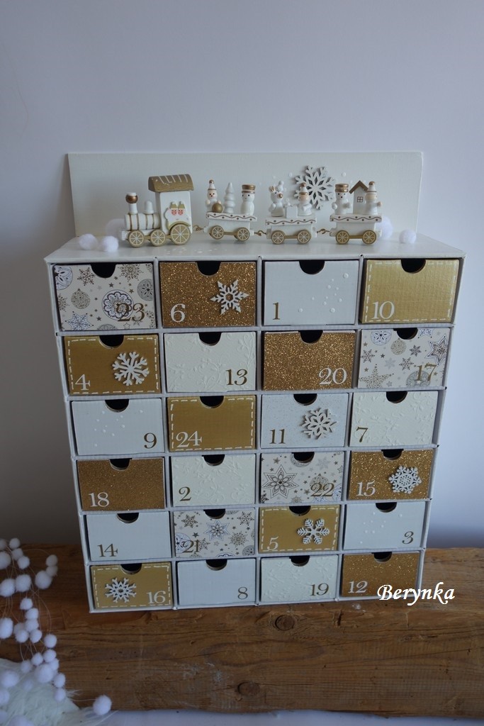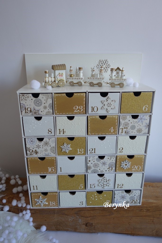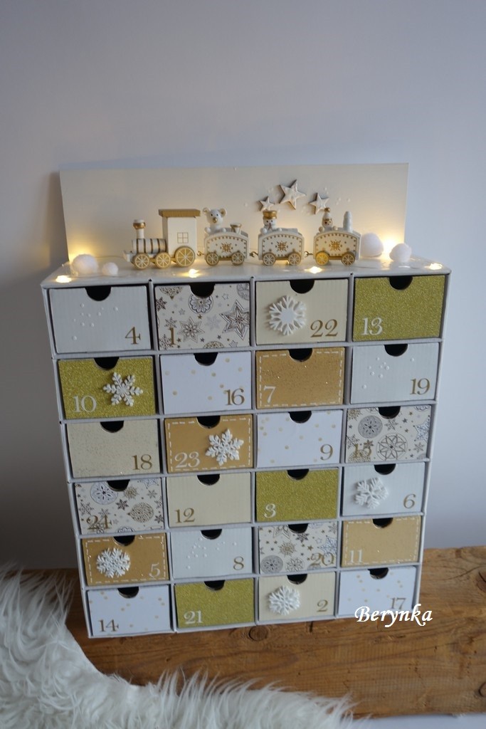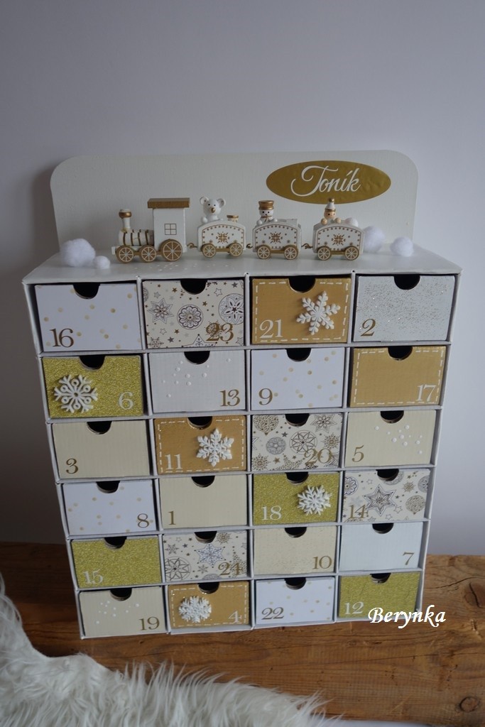 Adventní kalendář bílo-zlatý s dřevěným vláčkem