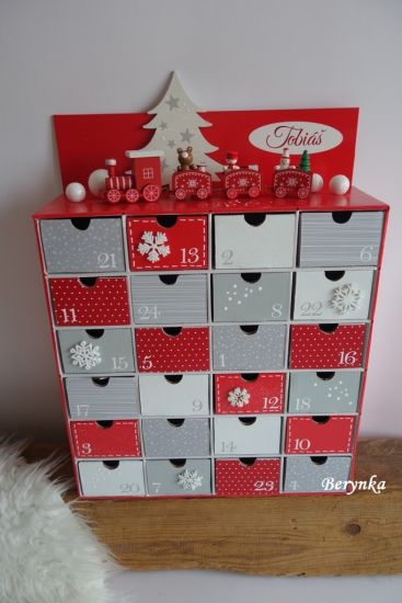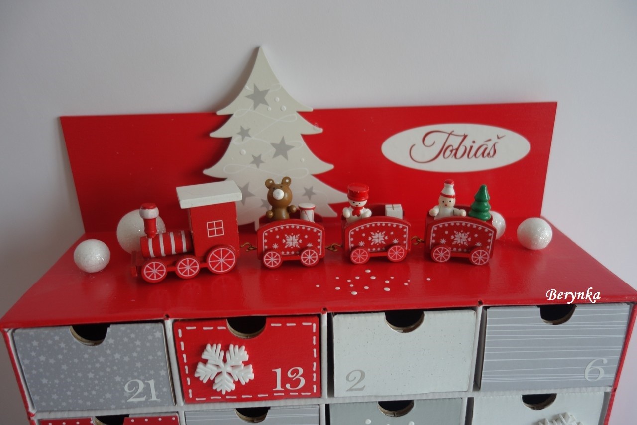Adventní kalendář červeno-šedý s mašinkou