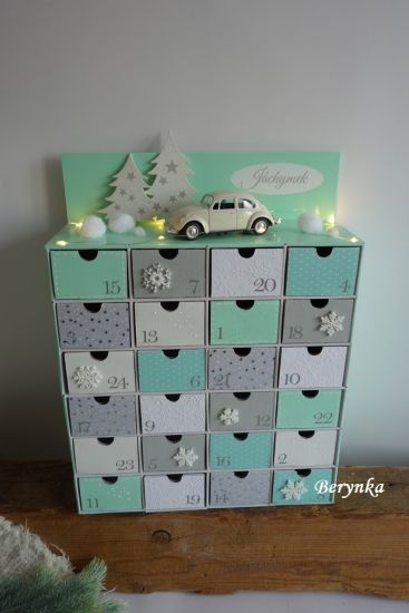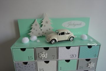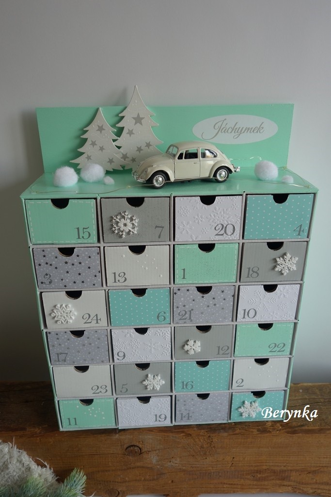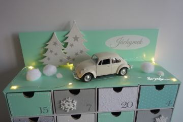 Adventní kalendář mátovo-šedý s autíčkem