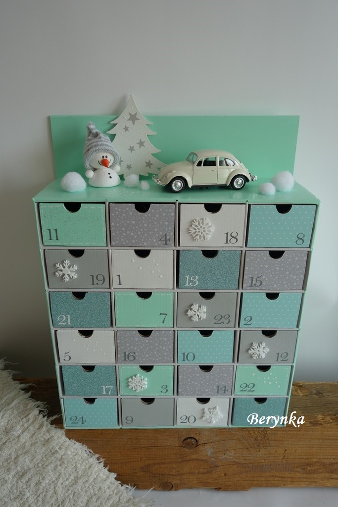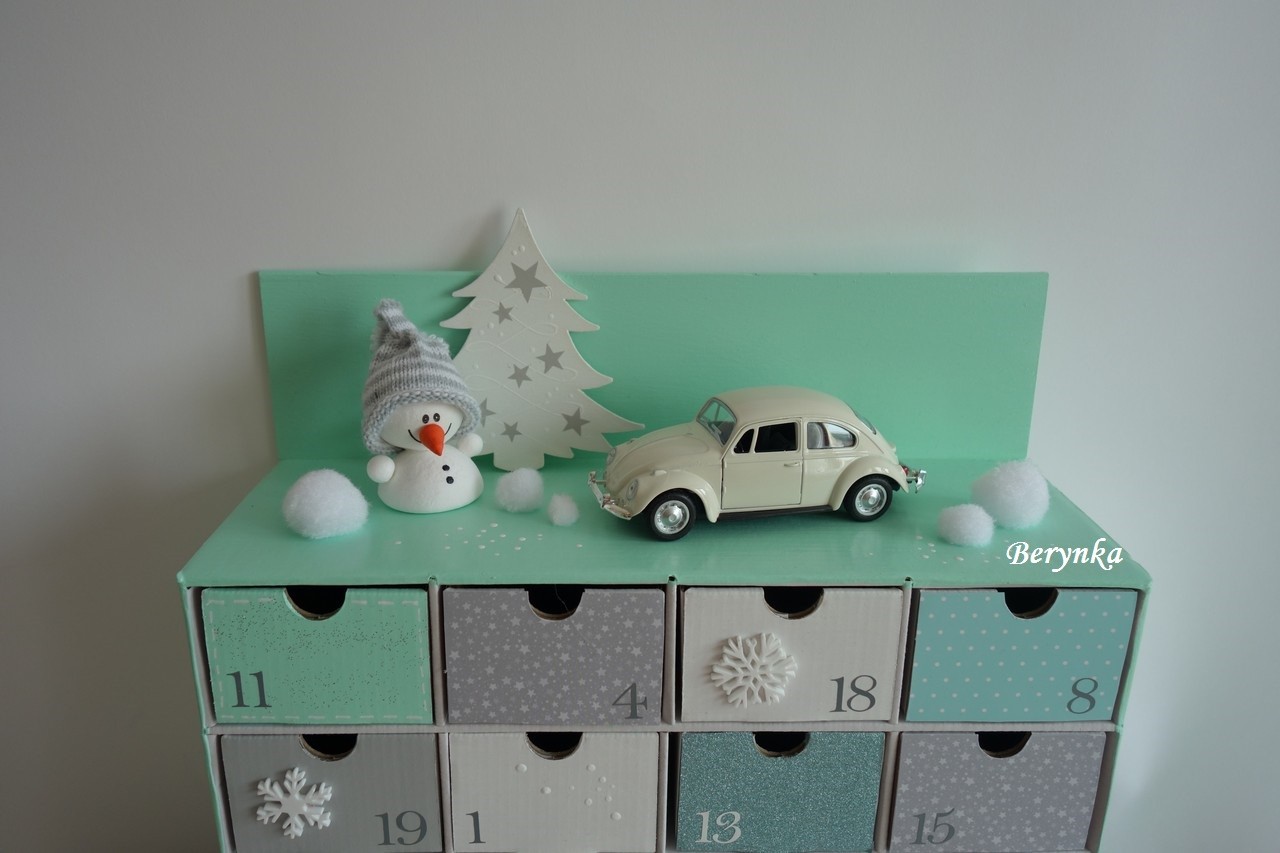 Adventní kalendář mátovo-šedý s autíčkem a sněhulákem