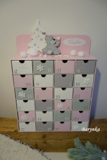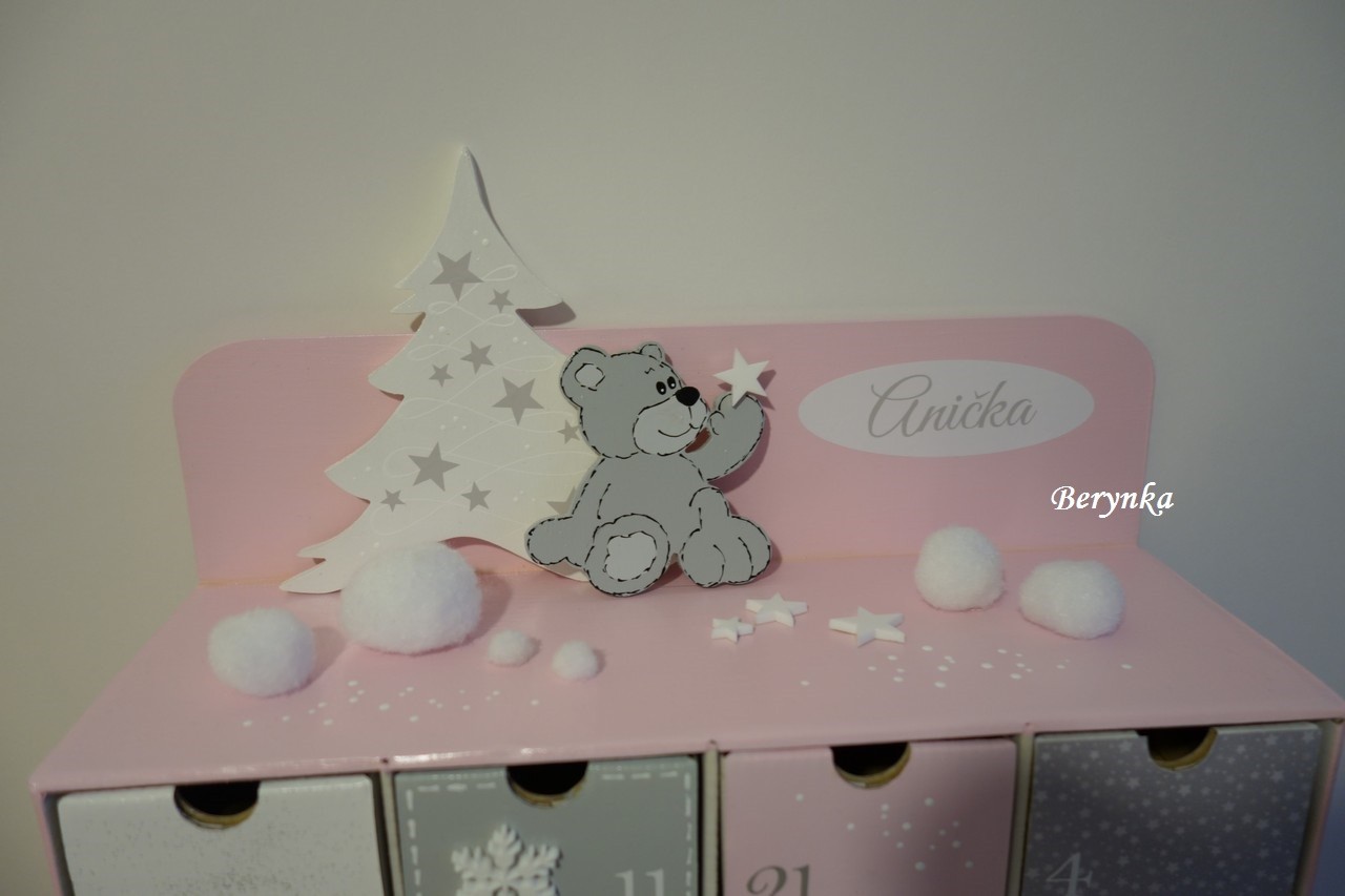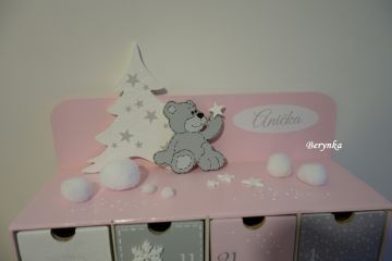 Adventní kalendář růžovo-šedý s medvídkem a hvězdičkami