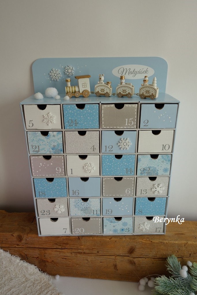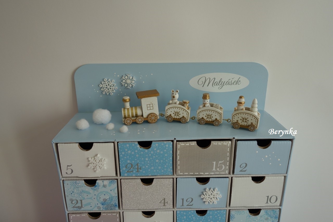 Adventní kalendář bledě modrý s mašinkou