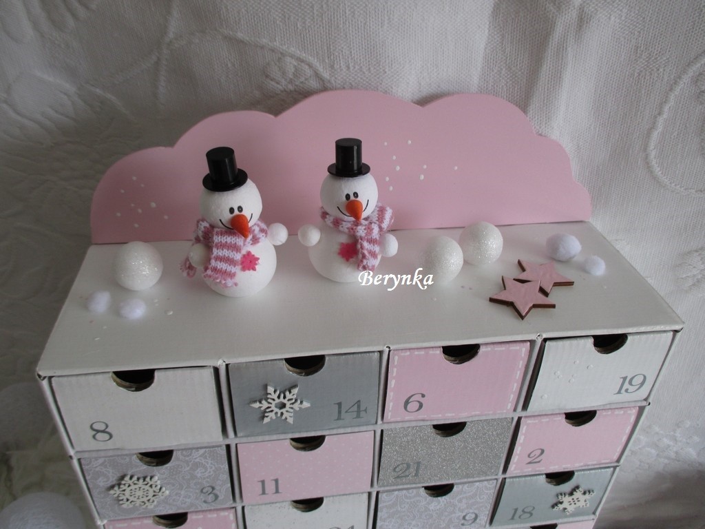 Adventní kalendář růžovo-šedý se sněhuláčky