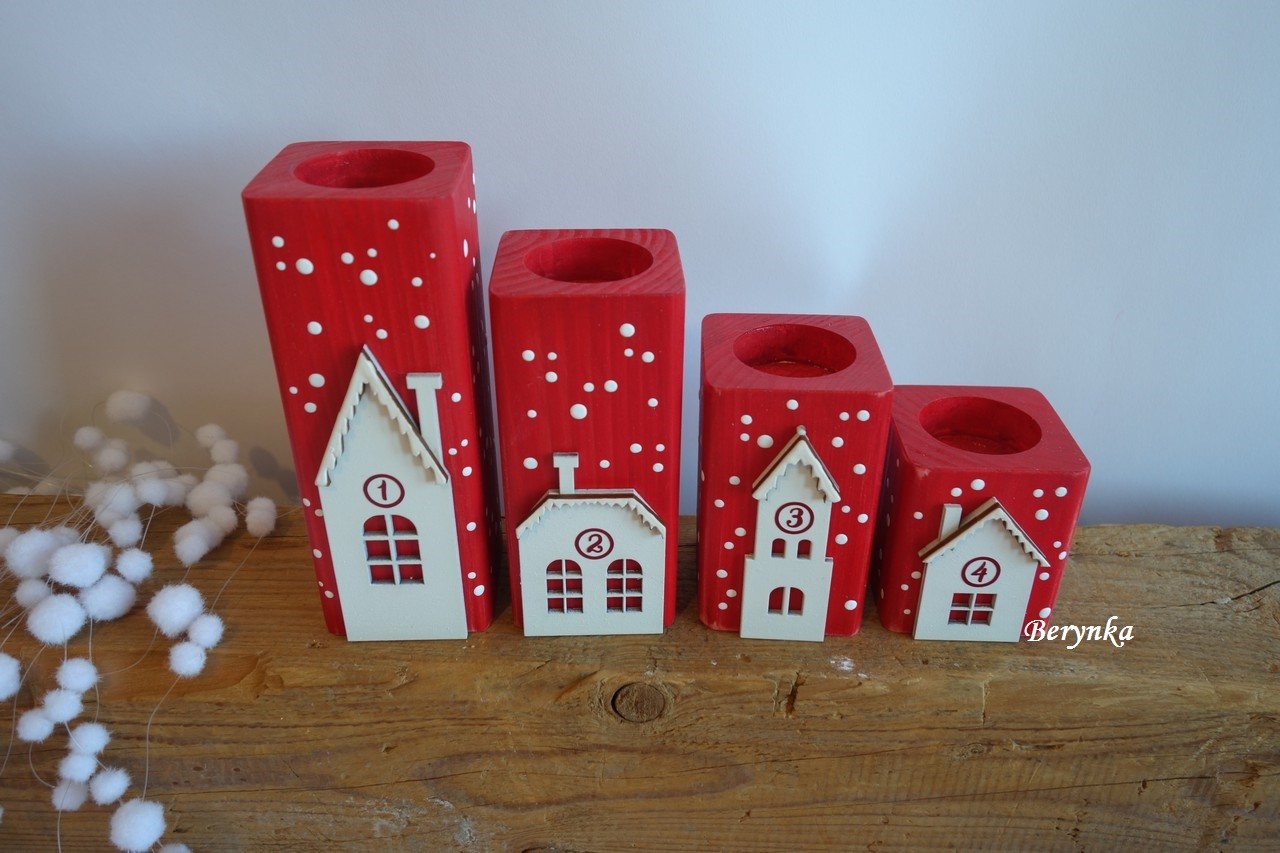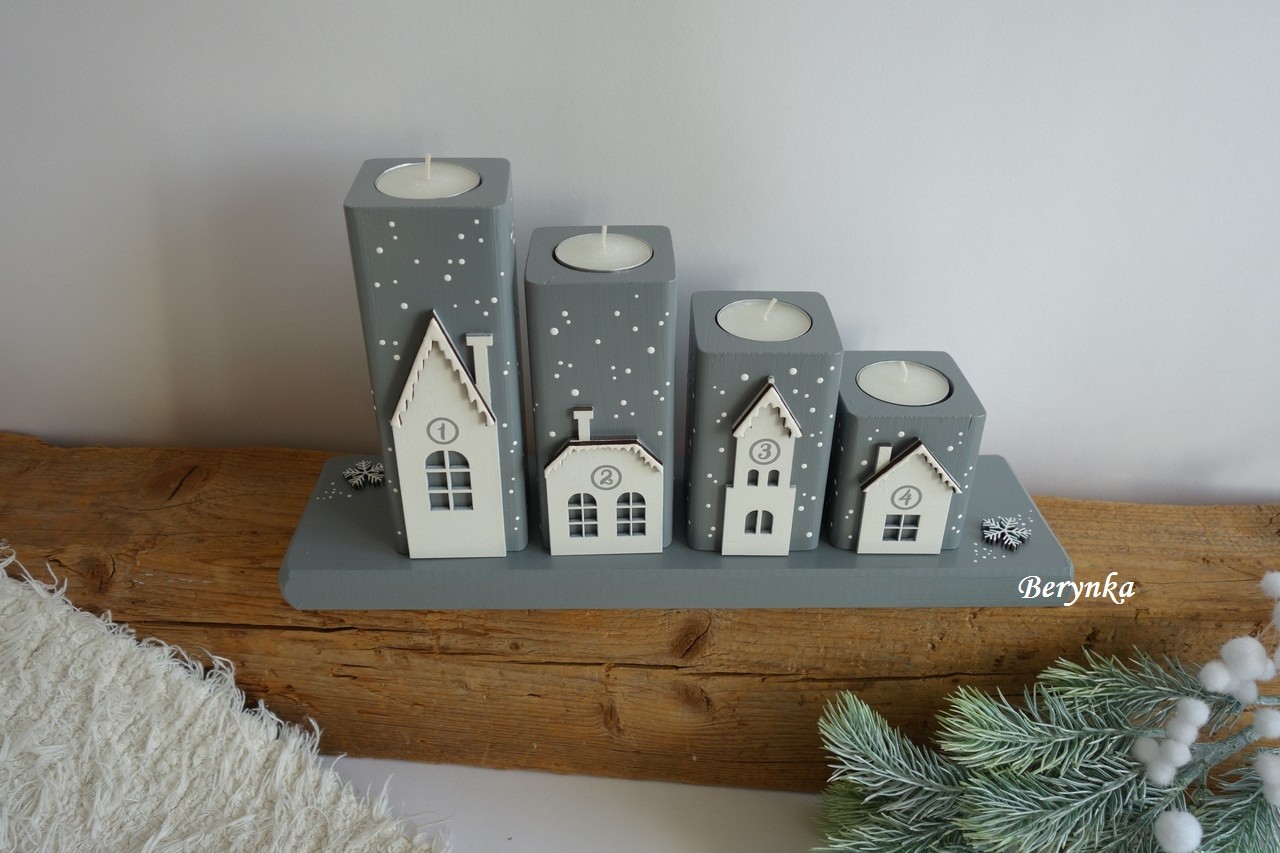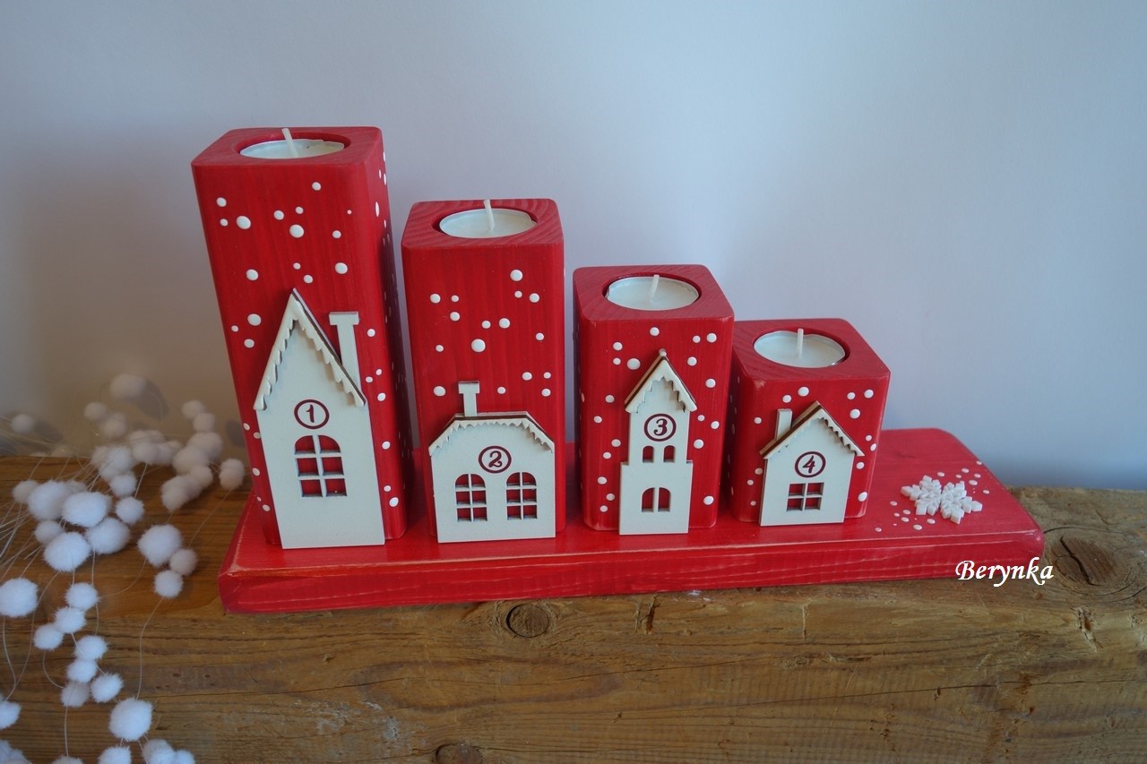 Adventní svícen stupňovitý s bílými domečky - různé barvy