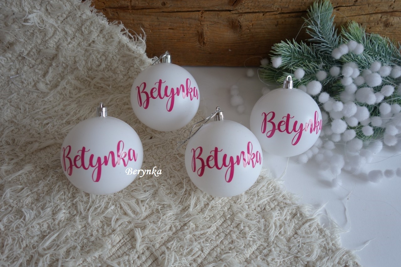 Vánoční baňky s textem na přání - bílé s růžovým nápisem