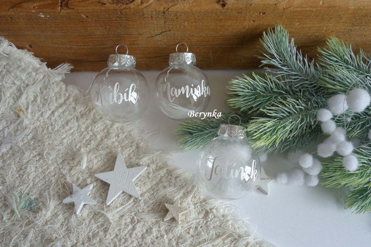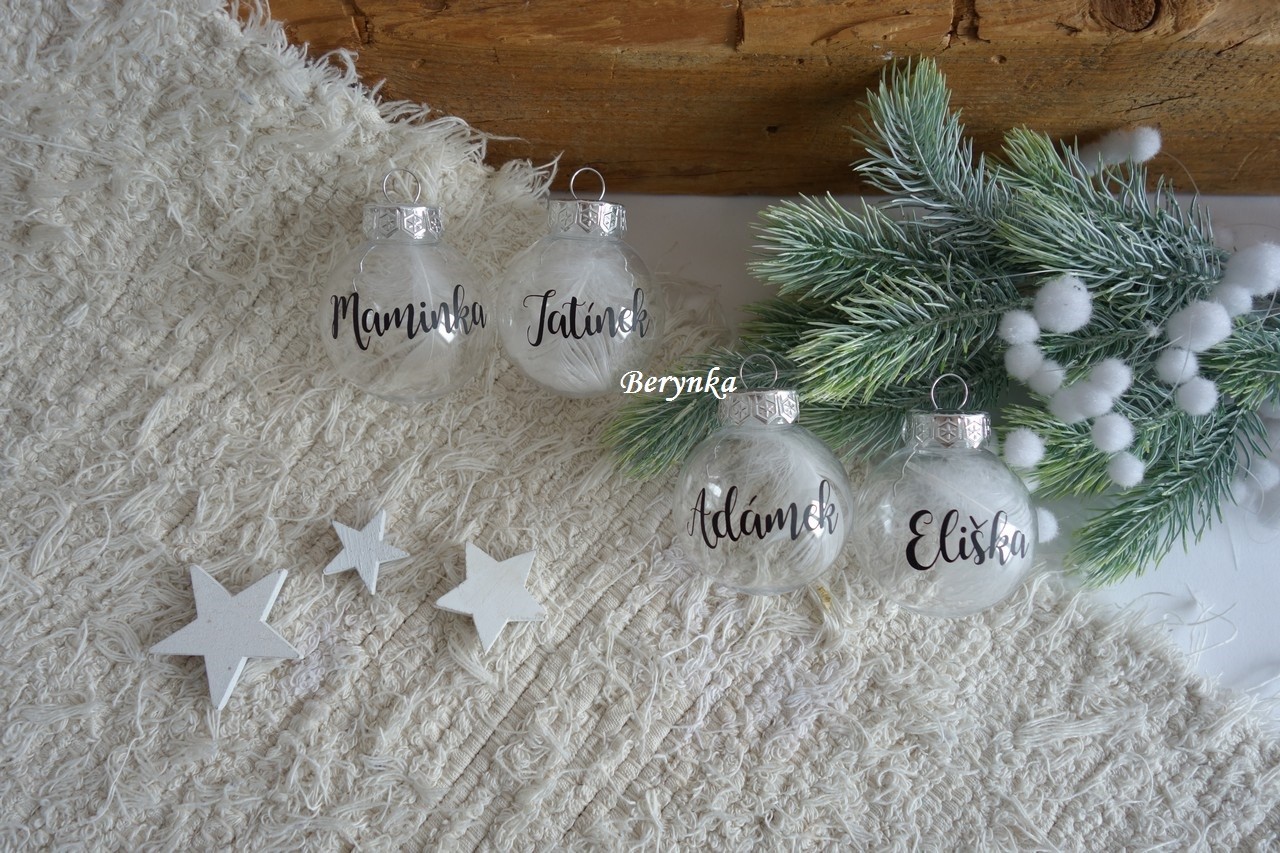 Vánoční baňky s textem na přání - průhledné s peříčkem