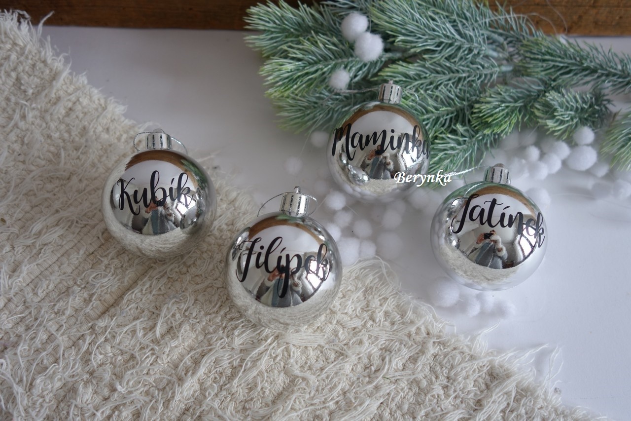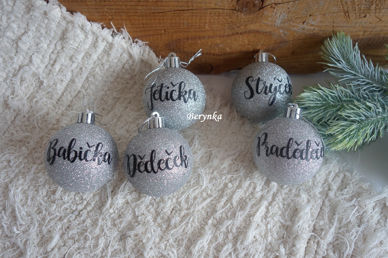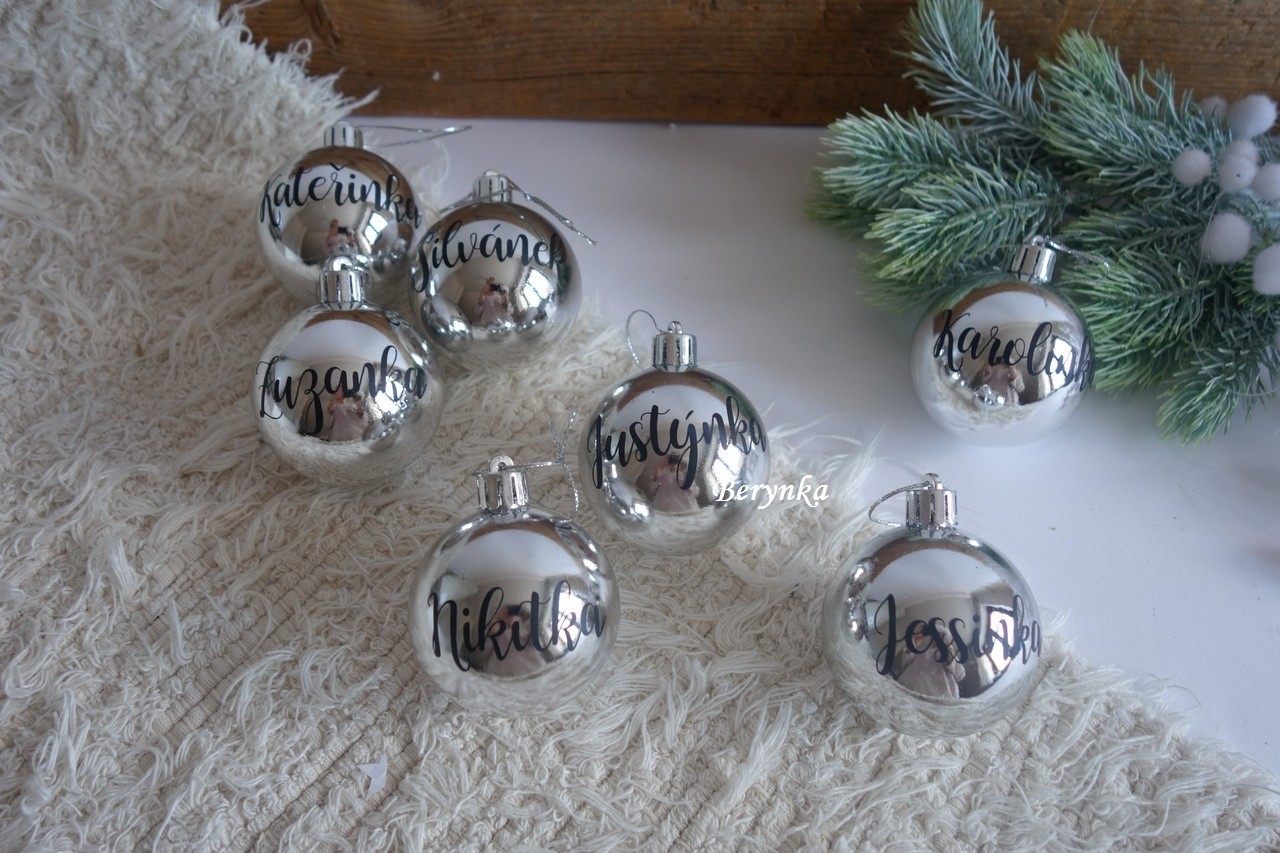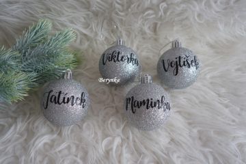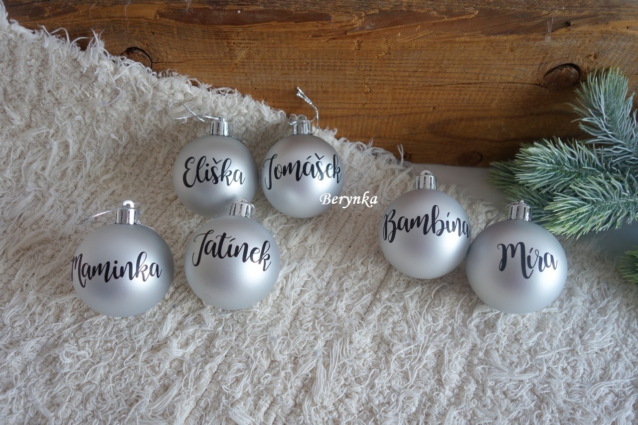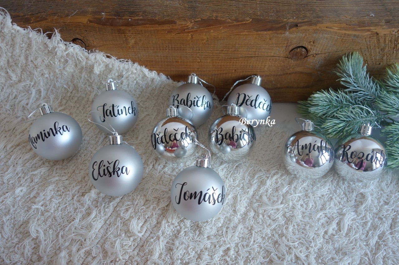 Vánoční baňky s textem na přání - stříbrné s černým nápisem